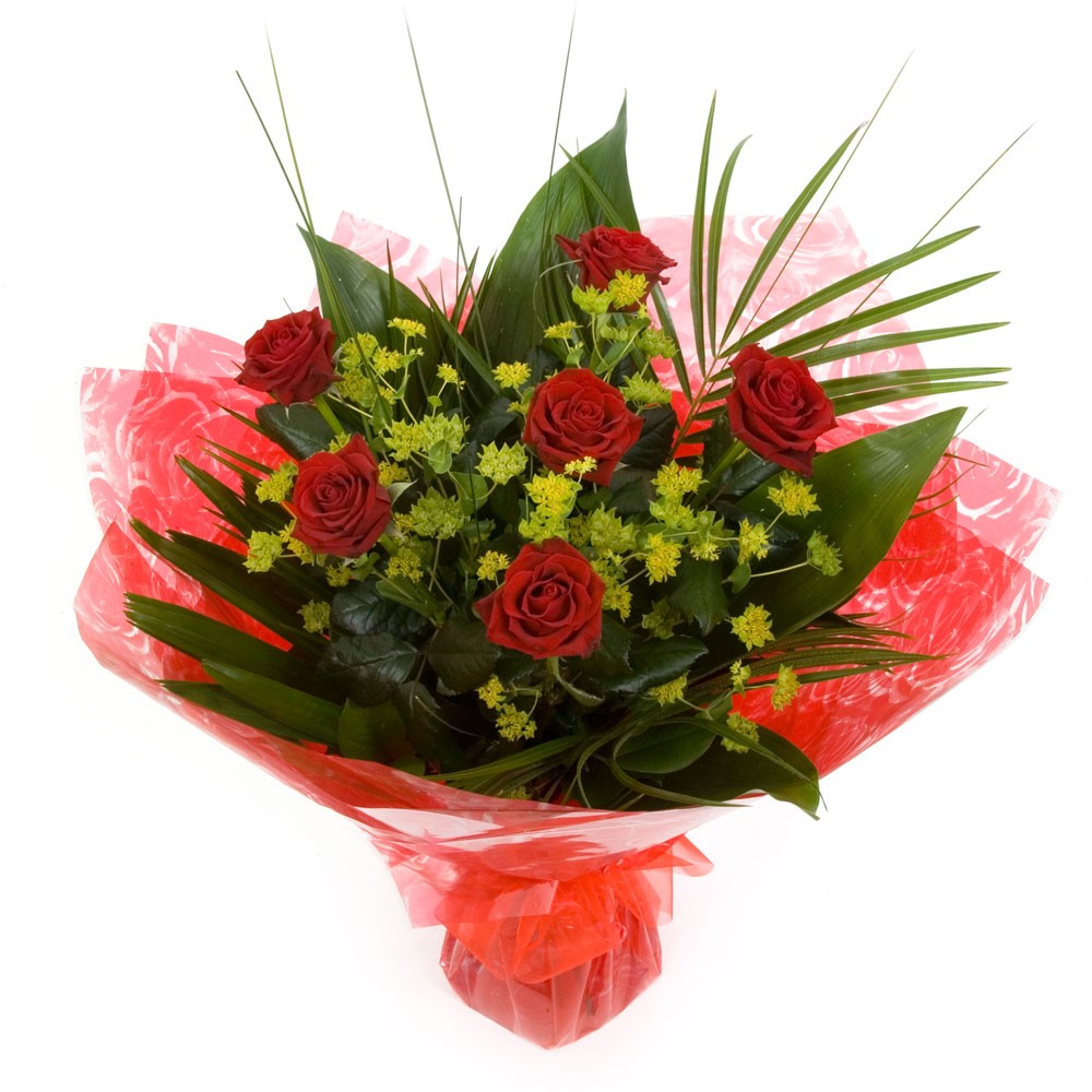 A Stunning handtied of 6 red roses arranged. The perfect gift for Valentines Day.